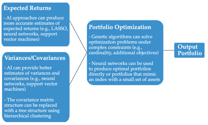 The results of the fundamental analysis can optimize asset allocation in financial portfolios. For example, AI techniques often provide better estimates of returns and covariances than more conventional methods. Further, they can help construct portfolios that meet performance targets more closely than portfolios created using traditional methods. For example, genetic algorithms can solve complex optimization problems with constraints (e.g., restricting the number of assets or setting minimum holding thresholds, see Figure 3).