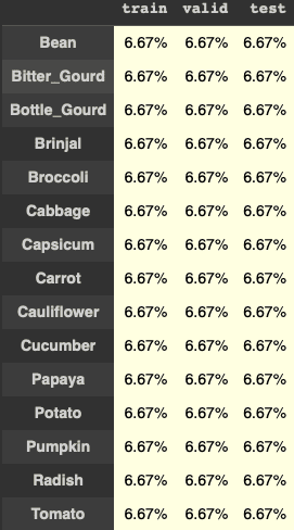 When working with data, especially supervised learning, it is often a best practice to check data imbalance. For example, Figure 3 shows the percentage of each vegetable (category) across different splits (train, valid, and test), and it clearly shows that the data is perfectly balanced across all splits.