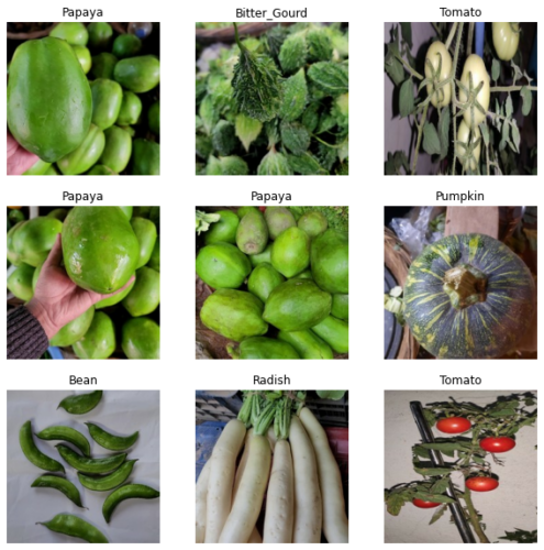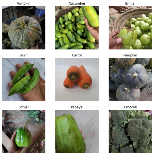 Figure 2 shows 9 of the 15 vegetable image categories from the dataset. At first glance, the dataset has a good amount of variation within the image. For example, brinjal is present at multiple scales in the image. But we would still apply data augmentation to ensure the model doesn’t overfit and generalize well on the test dataset.