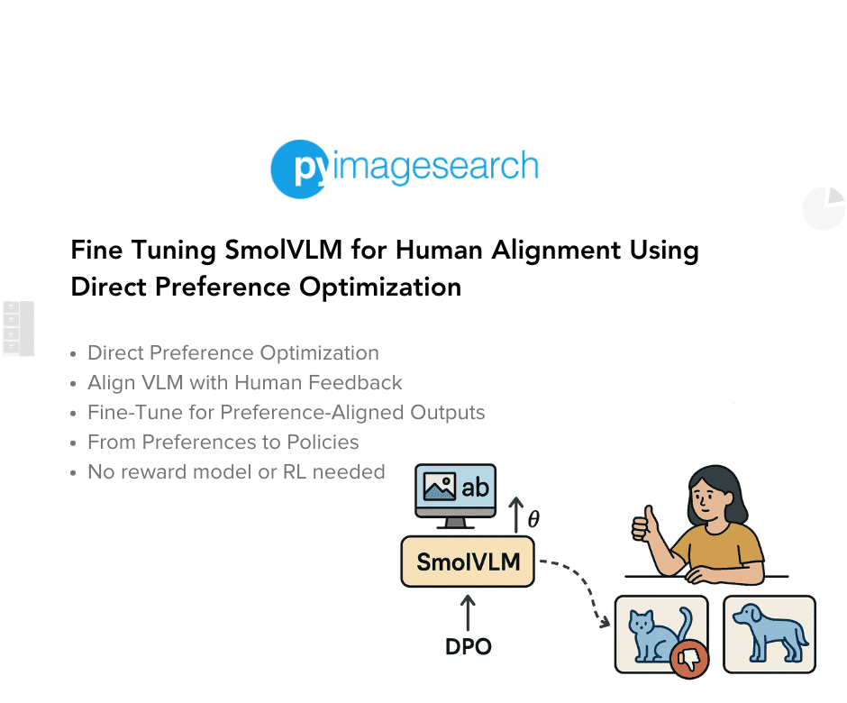 Mangla, P. “Fine Tuning SmolVLM for Human Alignment Using Direct Preference Optimization,” PyImageSearch, P. Chugh, S. Huot, A. Sharma, and P. Thakur, eds., 2025, https://pyimg.co/wp9dc