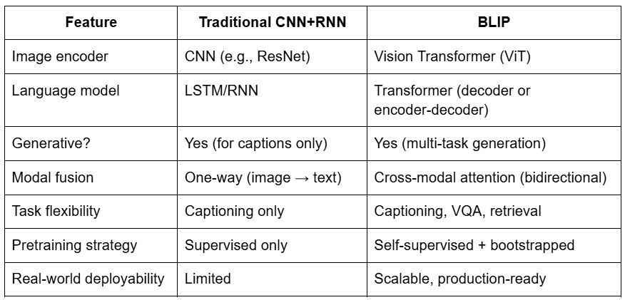 - Task-Specific: These models were trained only for captioning and couldn’t adapt to related tasks like visual question answering (VQA), image-text retrieval, or multimodal reasoning. Every new task required retraining from scratch.