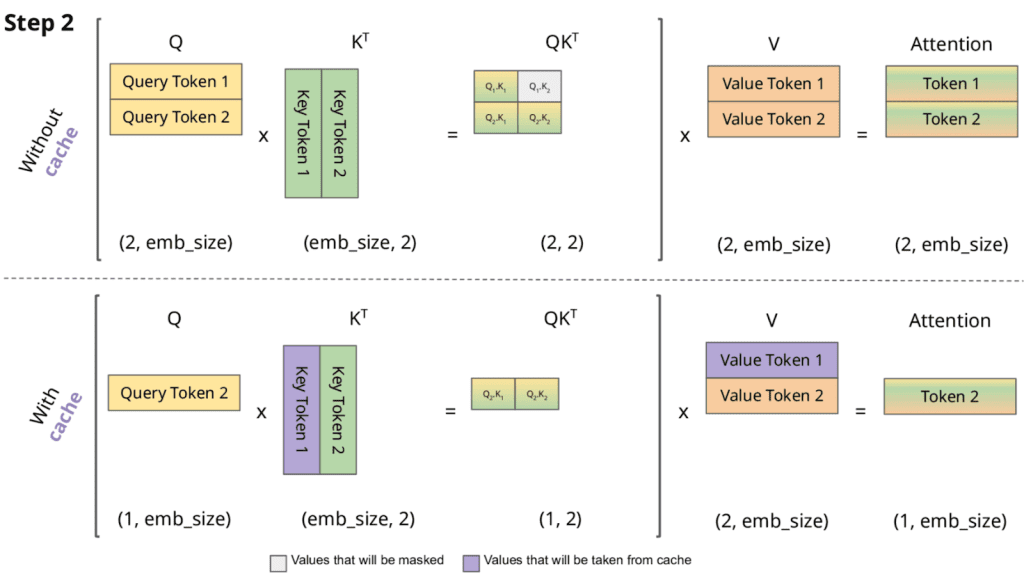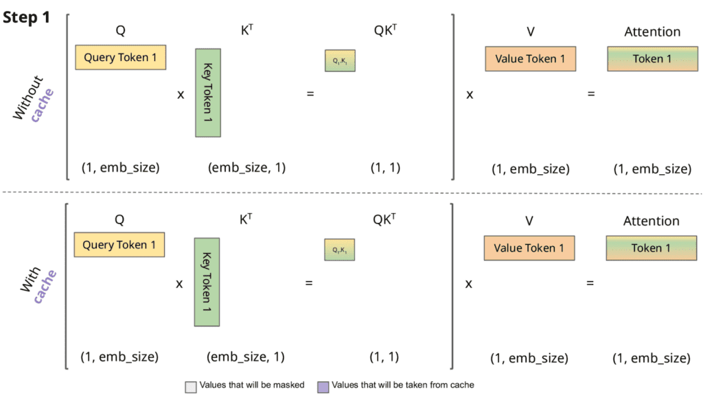 KV caching sidesteps this by storing the past keys and values in memory as they are first computed, so that at step , the model only needs to compute