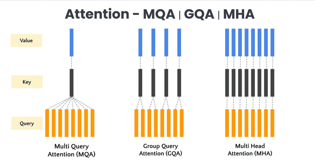 reduction in cache memory. We illustrate this with equations and intuitive diagrams, contrasting vanilla multi‐head attention, multi‐query attention, and the GQA middle ground.