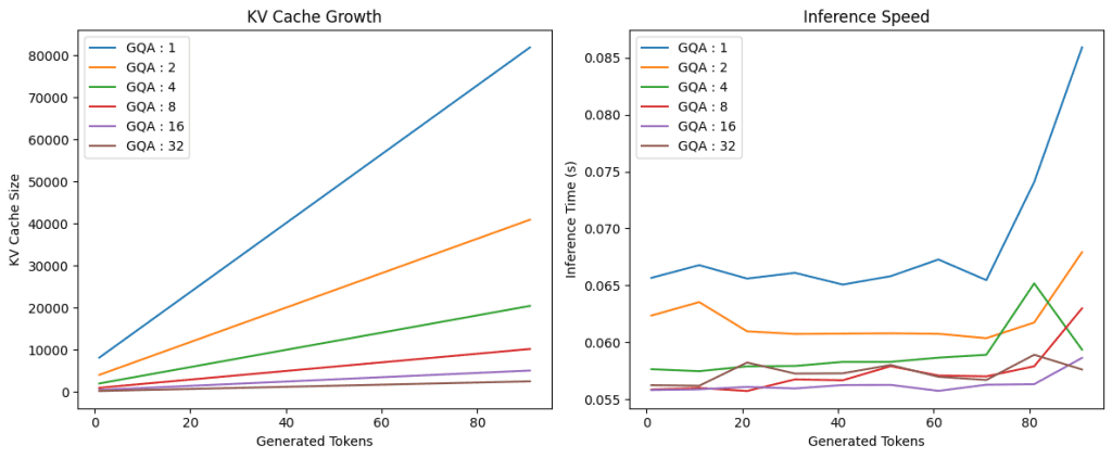 Finally, we walk through a hands-on implementation: building a toy TransformerBlock in PyTorch that supports arbitrary GQA groupings, wiring up KV cache growth, and running inference experiments across group sizes. We plot how cache size and per-token inference time evolve for , analyze the memory-latency trade-off, and distill practical guidelines for choosing
