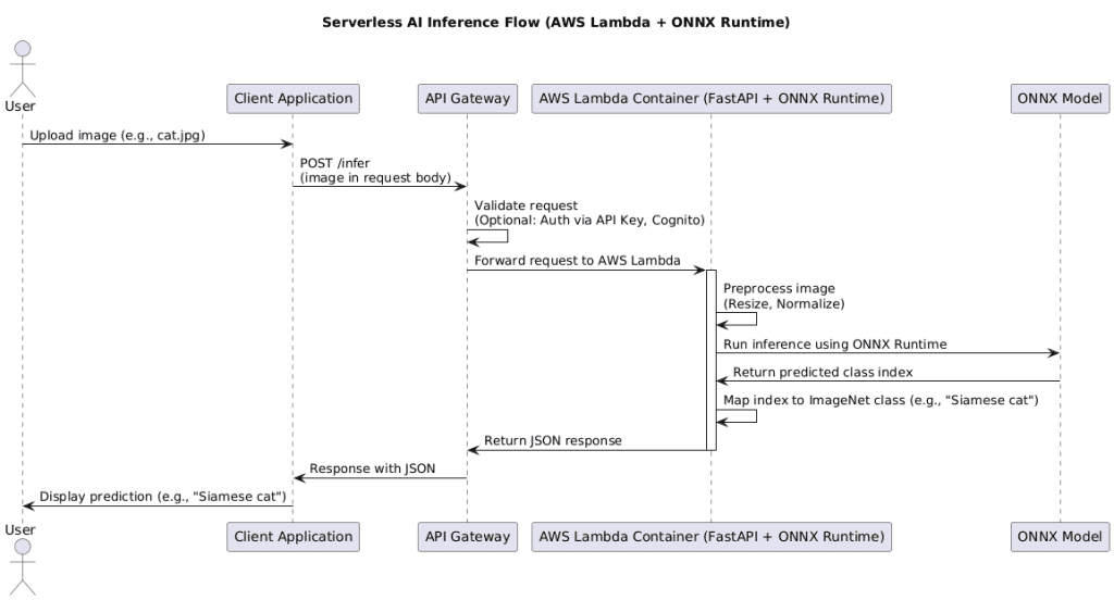 - AWS Lambda loads the AI model and performs inference using ONNX Runtime.
