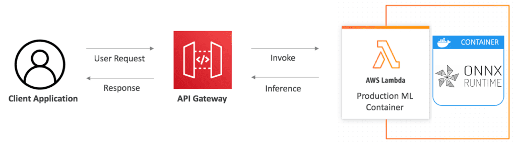 In Figure 1, a client application sends a request through Amazon API Gateway, which triggers an AWS Lambda function running ONNX Runtime for model inference. The response is then sent back to the client.