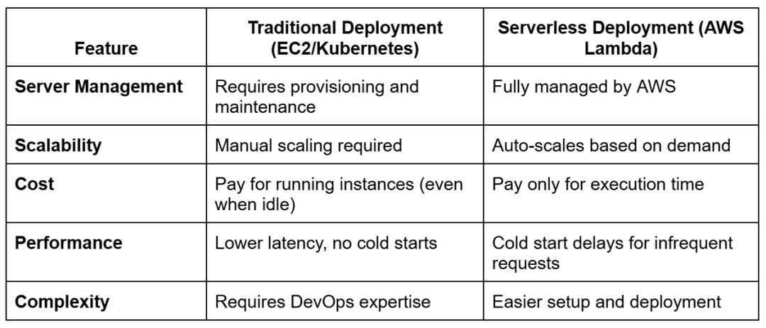 For frequent, large-scale AI workloads, EC2 or Kubernetes might be a better choice. But for lightweight inference models that run intermittently, AWS Lambda is highly cost-efficient and scalable.