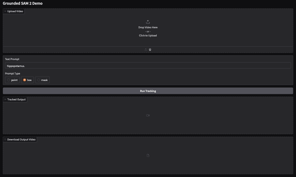 We now create a simple Gradio web interface that allows users to upload a video, write a text prompt, choose the prompt type, and visualize the segmentation tracking result directly.