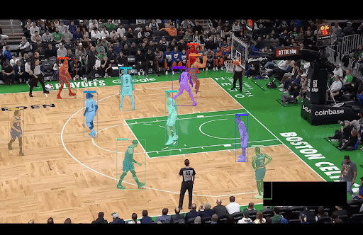In this example, we apply two different text prompts to the same image: player in white and player in blue. Instead of running SAM 3 once, we loop over both prompts, and each text query produces a new set of instance masks. We then merge all detections into a single result and visualize them together.