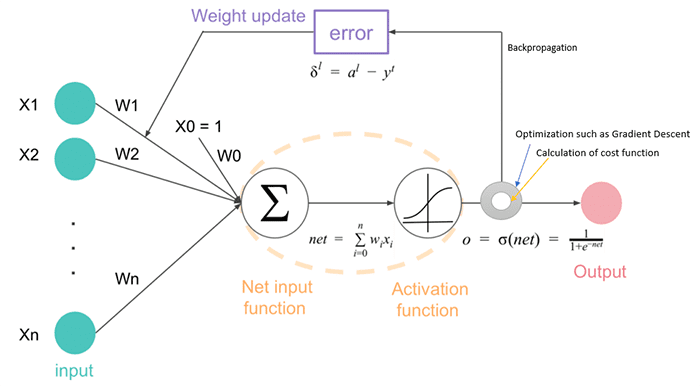 Typical loss functions include binary cross-entropy (two-class classification), categorical cross-entropy (multi-class classification), mean squared error (regression), etc.