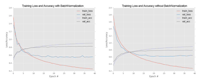 When we plot MiniVGGNet with batch normalization (left) and without batch normalization (right) side-by-side in Figure 2, we can see the positive effect batch normalization has on the training process: