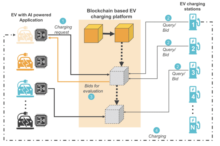 Together with peer-to-peer (P2P) blockchain technology, AI can help galvanize electric vehicle (EV) charging stations’ deployment (Figure 6). On the EV owner’s side, AI technologies can aid in selecting the suitability and management of charging stations. In contrast, on the charging station’s side, blockchain technology-based platforms can enable the discovery of charging stations and smart contracting. AI will initiate the charging process by requesting the blockchain-based charging platform. This request contains EV location, preferred charging time, etc. Simultaneously, charging stations will keep sending queries to the trading platform for new demanding requests. After a match, the bidding process is started and repeated until the price matches. Finally, AI displays the route map on the consumer’s mobile/tablet screen. A smart contract executes between the EV’s owner and charging station, and its record gets stored on the blockchain platform.