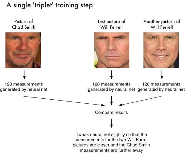 From there, the general idea is that we’ll tweak the weights of our neural network so that the 128-d measurements of the two Will Ferrells will be closer to each other and farther from the measurements for Chad Smith.