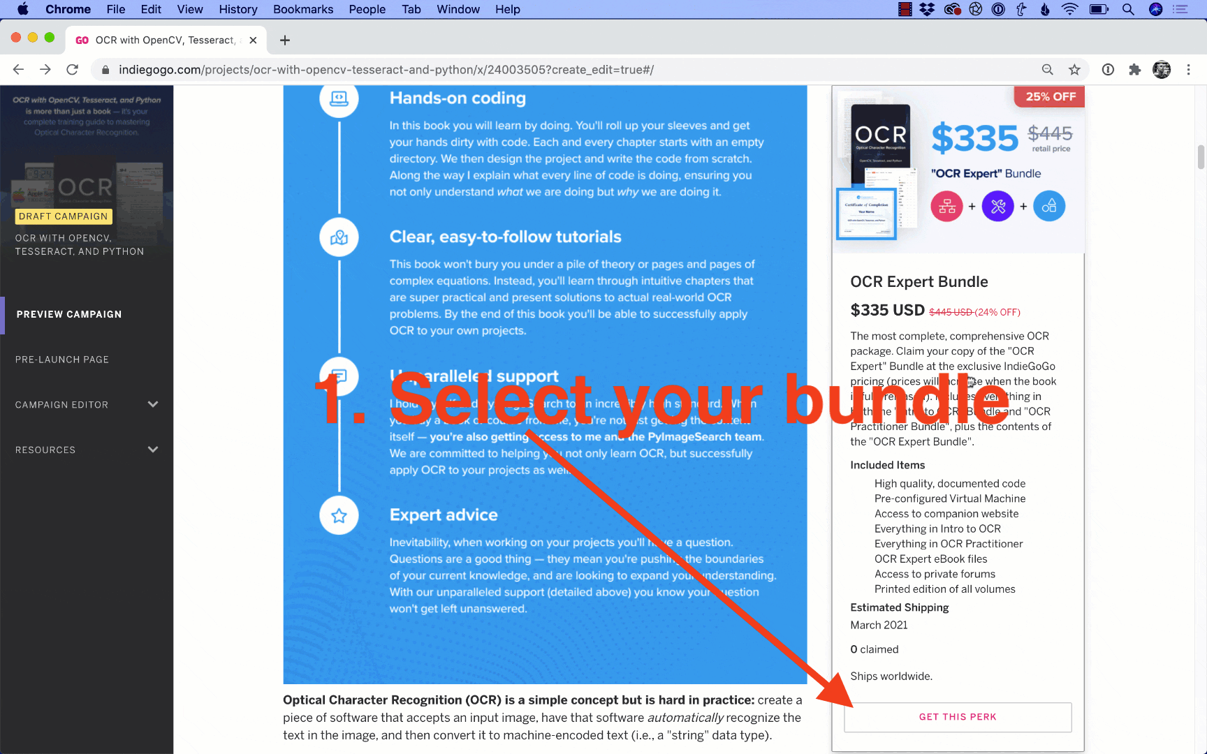 When the OCR with OpenCV, Tesseract, and Python campaign launches on Wednesday, there will be 1000s of PyImageSearch readers (and not to mention, other IndieGoGo users) reading the campaign page and deciding which perk to select.