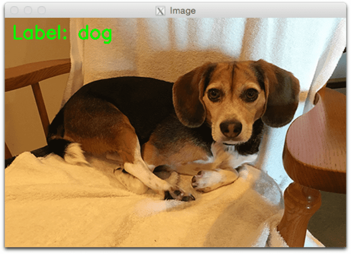 Notice how the dog class has the largest scoring function value, which implies that the “dog” class would be chosen as the prediction by our classifier. In fact, we can see the text dog correctly drawn on our input image (Figure 2) in Figure 3.