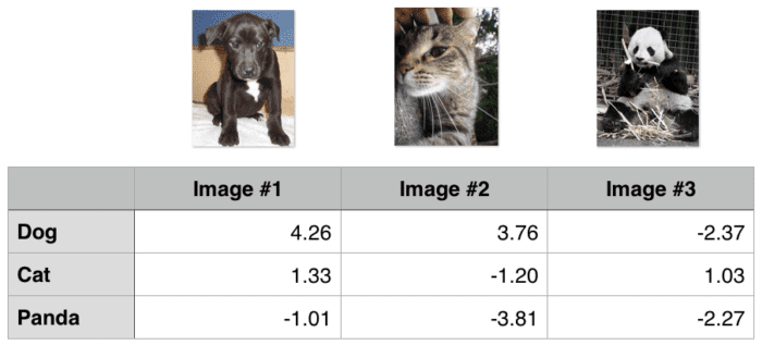 Given some arbitrary weight matrix W and bias vector b, the output scores of f(x,W) = W x+b are displayed in the body of the matrix. The larger the scores are, the more confident our scoring function is regarding the prediction.