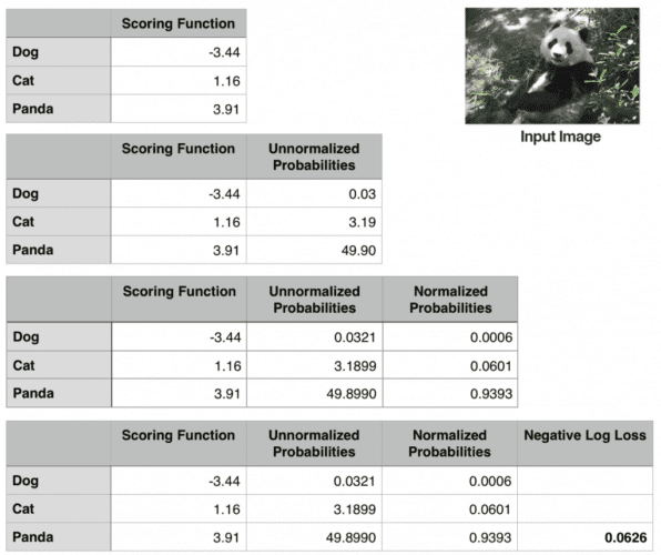 To demonstrate cross-entropy loss in action, consider Figure 6. Our goal is to classify whether the image above contains a dog, cat, or panda. Clearly, we can see that the image is a “panda” — but what does our Softmax classifier think? To find out, we’ll need to work through each of the four tables in the figure.