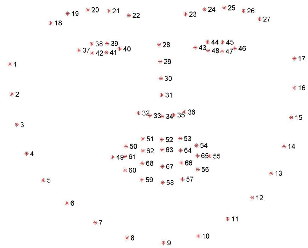 Dlibās 68-point facial landmark detector tends to be the most popular facial landmark detector in the computer vision field due to the speed and reliability of the dlib library.