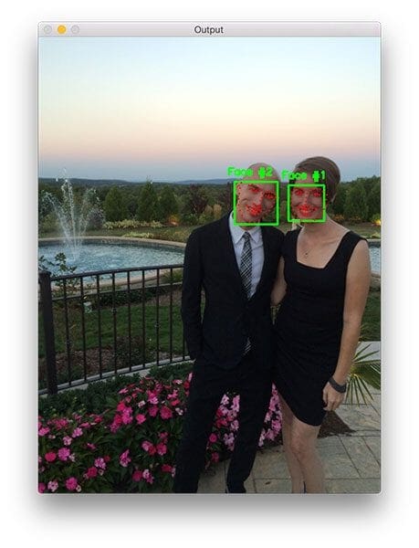 For both people in the image (myself and Trisha, my fiancƩe), our faces are not only detected but also annotated via facial landmarks as well.