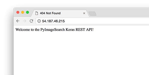 You should now see the text “Welcome to the PyImageSearch Keras REST API!” in your browser.