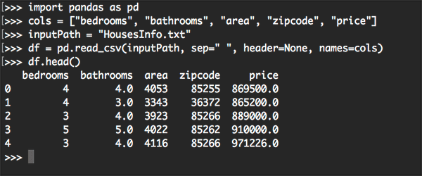 bedrooms bathrooms area zipcode price 0 4 4.0 4053 85255 869500.0 1 4 3.0 3343 36372 865200.0 2 3 4.0 3923 85266 889000.0 3 5 5.0 4022 85262 910000.0 4 3 4.0 4116 85266 971226.0