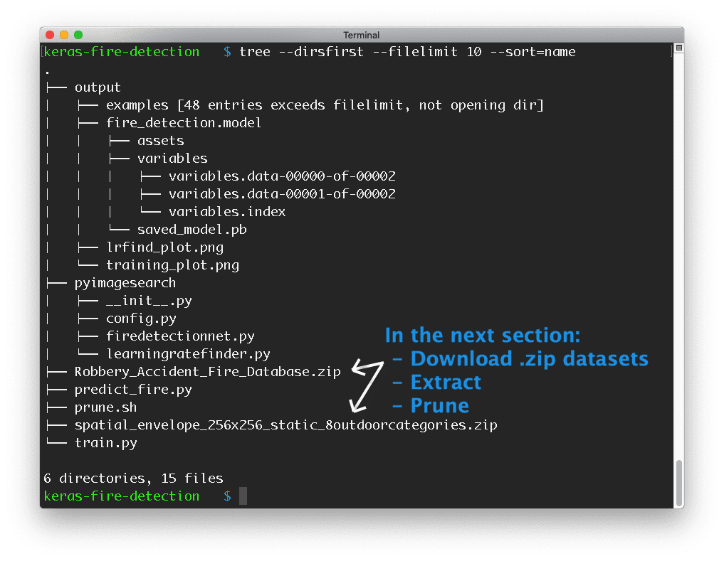 $ tree --dirsfirst --filelimit 10 . ├── Robbery_Accident_Fire_Database2 │ ├── Accident [887 entries] │ ├── Fire [1315 entries] │ ├── Robbery [2073 entries] │ └── readme.txt ├── spatial_envelope_256x256_static_8outdoorcategories [2689 entries] ├── output │ ├── examples [48 entries] │ ├── fire_detection.model │ │ ├── assets │ │ ├── variables │ │ │ ├── variables.data-00000-of-00002 │ │ │ ├── variables.data-00001-of-00002 │ │ │ └── variables.index │ │ └── saved_model.pb │ ├── lrfind_plot.png │ └── training_plot.png ├── pyimagesearch │ ├── __init__.py │ ├── config.py │ ├── firedetectionnet.py │ └── learningratefinder.py ├── Robbery_Accident_Fire_Database.zip ├── spatial_envelope_256x256_static_8outdoorcategories.zip ├── prune.sh ├── train.py └── predict_fire.py 11 directories, 16 files
