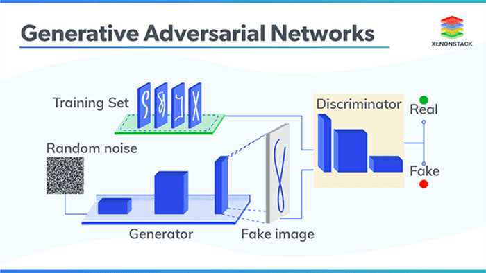 - A generator that accepts an input vector of randomly generated noise and produces an output “imitation” image that looks similar, if not identical, to the authentic image