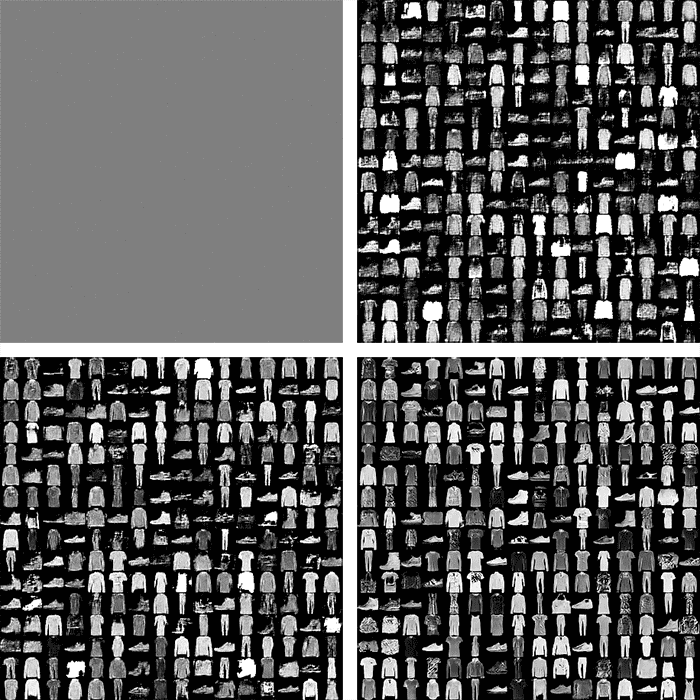- The top-left contains 256 (in an 8×8 grid) of our initial random noise vectors before even starting to train the GAN. We can clearly see there is no pattern in this noise. No fashion items have been learned by the GAN.