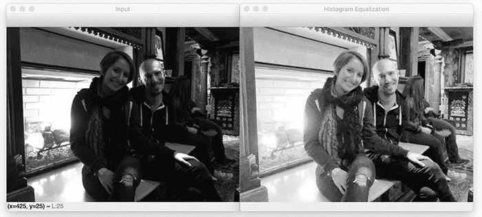By applying histogram equalization (right), we can see that not only are our faces visible, but we can see another couple sitting behind us! Without histogram equalization, you may have missed the other couple.