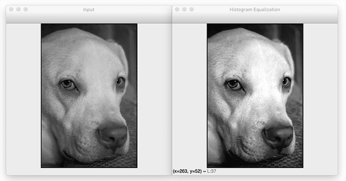 $ python simple_equalization.py --image images/dog.png [INFO] loading input image... [INFO] performing histogram equalization...