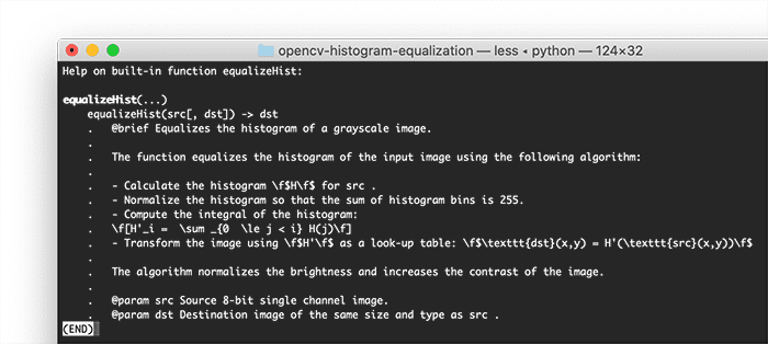 cv2.equalizeHist and cv2.createCLAHE.OpenCV includes implementations of both basic histogram equalization and adaptive histogram equalization through the following two functions: