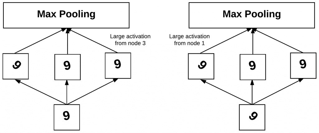 The same is true for the second example (Figure 1, right). Here we see the “9” rotated by −45 degrees, and since there is a filter in the CNN that has learned what a “9” looks like when it is rotated by −45 degrees, the neuron activates and fires. Again, these filters themselves are not rotation invariant — it’s just that the CNN has learned what a “9” looks like under small rotations that exist in the training set.