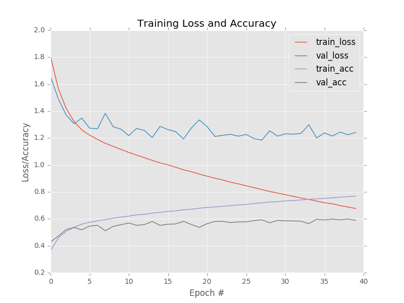 Around epoch 60 our testing accuracy saturates — we are unable to get past ≈70% classification accuracy, meanwhile our training accuracy continues to climb to over 85%. Again, gathering more training data, applying data augmentation, and taking more care to tune our learning rate will help us improve our results in the future.