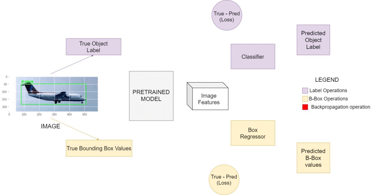 The main model will branch into two subsets: the regressor and the classifier. The former will output the bounding box’s starting and ending coordinates, while the latter will output the object label. The combined losses generated by these 5 values will serve in our backpropagation. Quite a simple way to start, isn’t it?